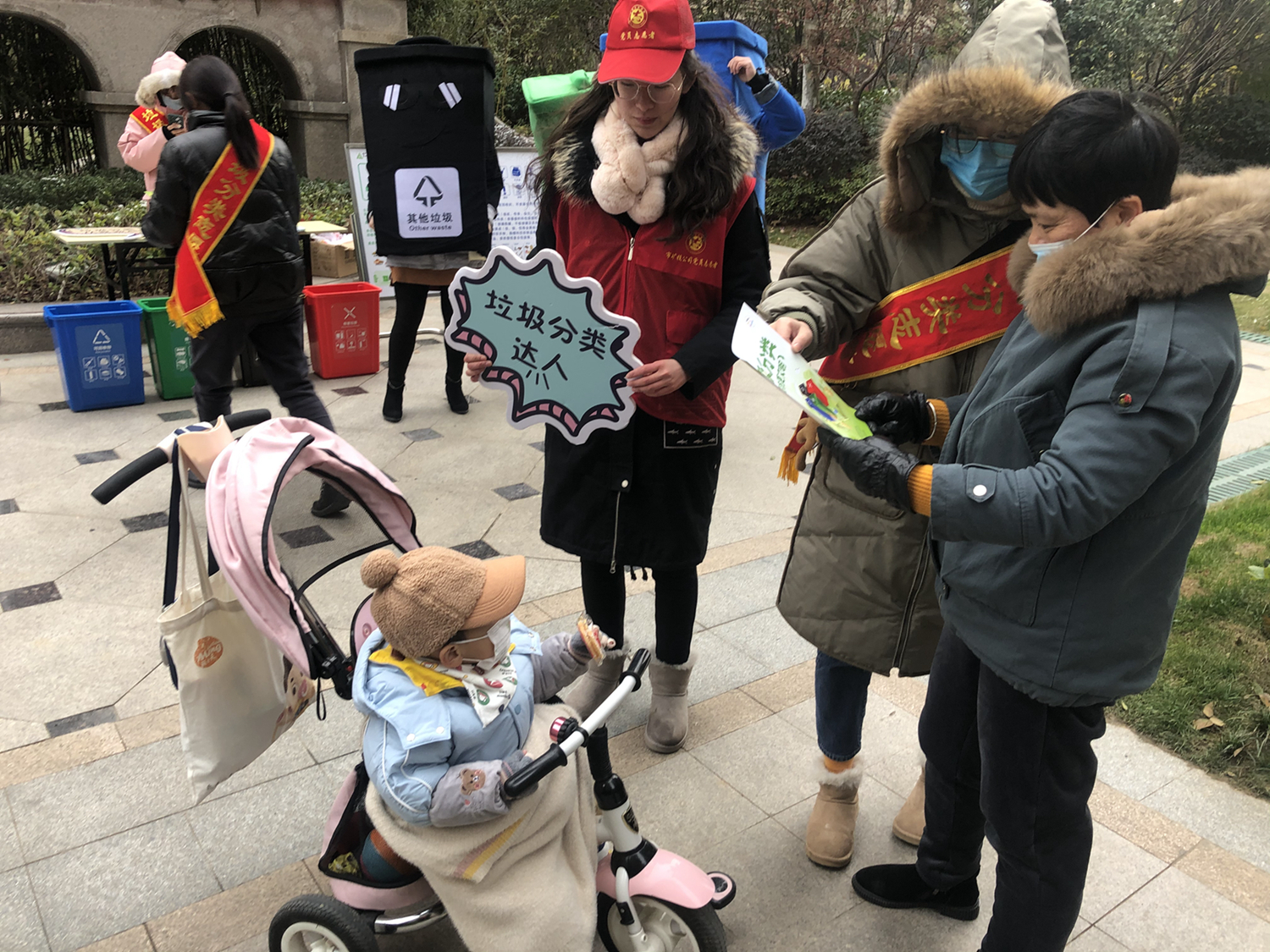 活動中,志愿者們身穿“可回收物”、“廚余垃圾”、“有害垃圾”、“其他垃圾”四色玩偶服,通過向居民發(fā)放宣傳單頁、開展“垃圾分分樂”、“垃圾分類跳棋”游戲等方式,向其宣傳垃圾分類相關(guān)知識?;顒蝇F(xiàn)場氣氛火熱,社區(qū)居民不畏嚴(yán)寒,紛紛從家中拿出廢舊電池、舊水銀溫度計等有害垃圾換取垃圾袋。