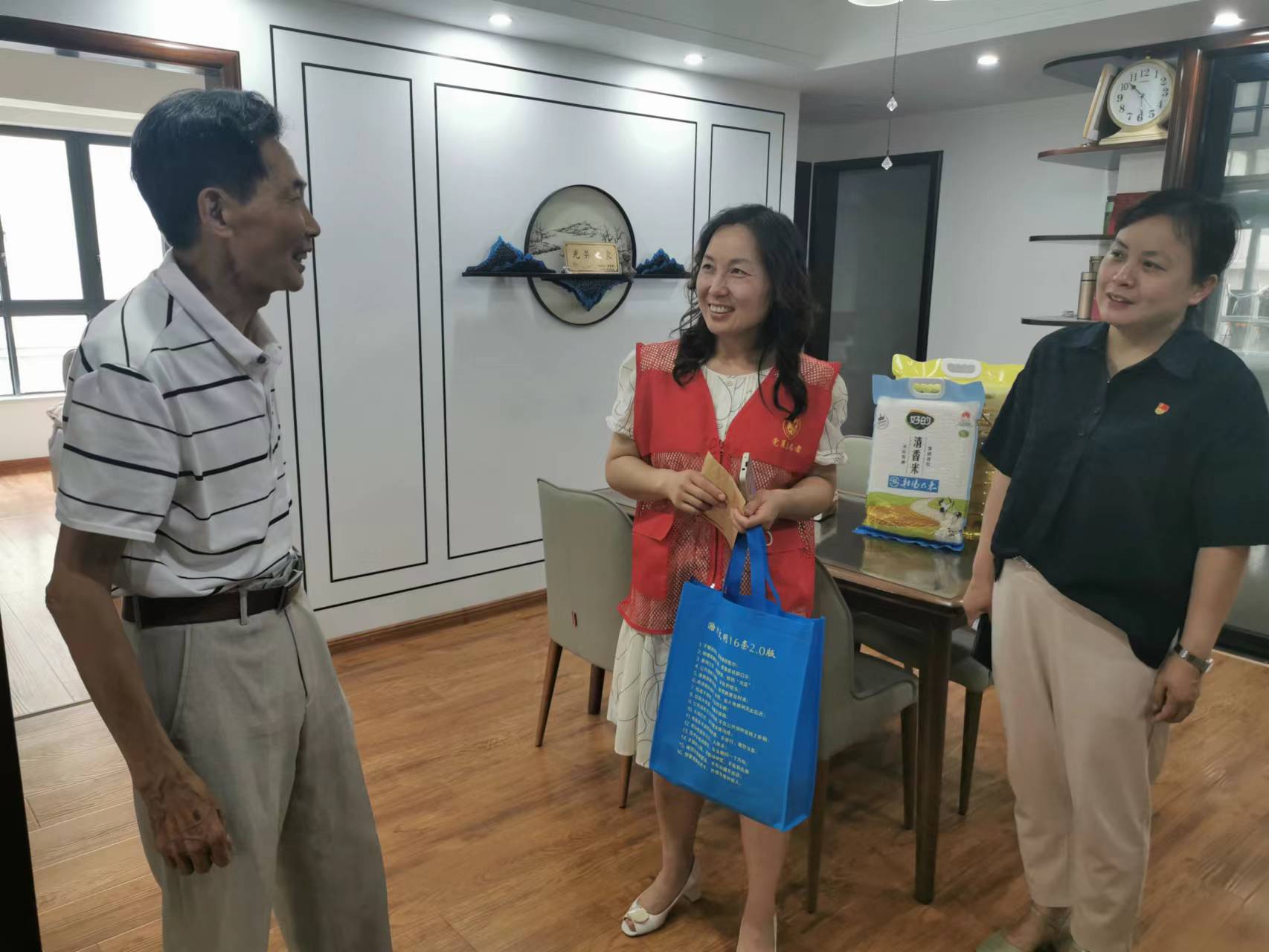 在天逸華庭小區(qū),志愿者們看望55年黨齡的老黨員甘黃興,關(guān)切地詢問他的家庭狀況、日常生活,表達對他多年發(fā)揮黨員先鋒模范作用、敬業(yè)奉獻的敬意,鼓勵他繼續(xù)弘揚光榮傳統(tǒng),發(fā)揚優(yōu)良作風,關(guān)心和支持社區(qū)工作。