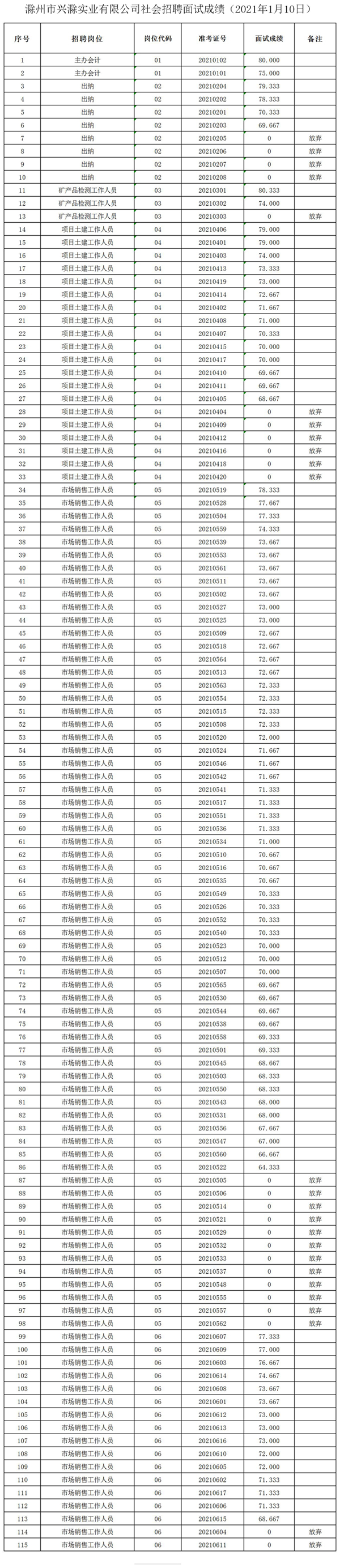 滁州市興滁實(shí)業(yè)有限公司社會(huì)招聘面試成績