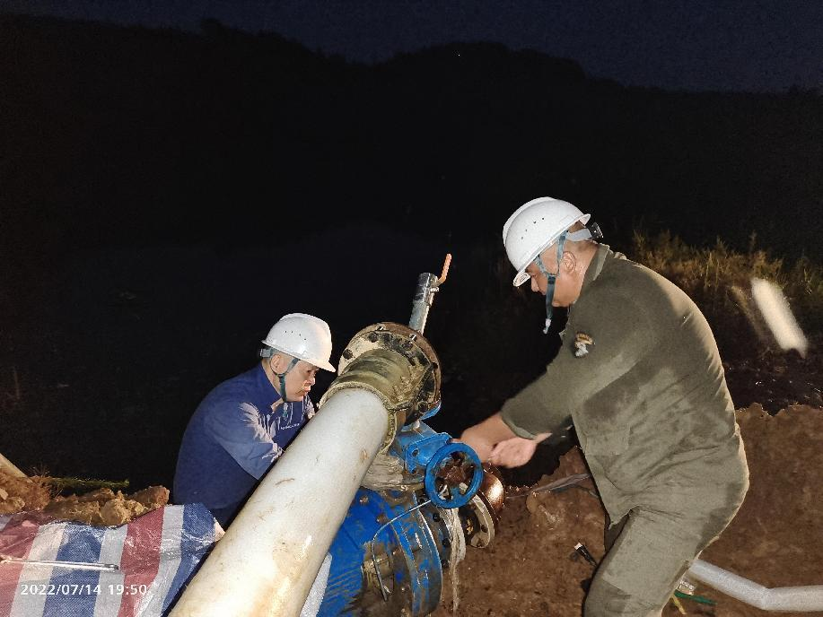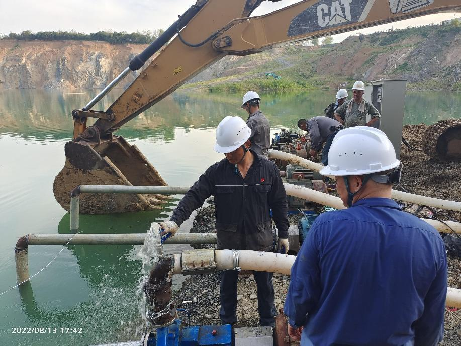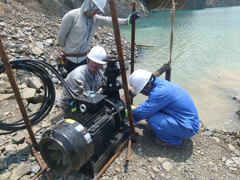 抗旱方案有了,可是要想把水從70米深的礦坑內抽到地面,不但需要揚程特別高的水泵,還需要高規(guī)格長距離的水管和電纜,還有很多配套零部件要采購。旱情就是命令,抗旱就是責任,興天礦業(yè)副總經(jīng)理趙崗牽頭落實抗旱物資采購,親自指揮設備調運安裝,帶領公司抗旱突擊隊和社區(qū)干部深入礦坑,一起研究水泵需要多大功率安裝在什么地方、水管需要多粗從哪里下放、電纜需要多長從哪里接電等問題。方案制定好了,老百姓的水稻不能等,挖掘機第一時間進場整理場地,興天礦業(yè)和社區(qū)準備的水泵、水管電纜等也迅速到位,抗旱突擊隊與社區(qū)干部群眾一起與時間賽跑,從早到晚緊張施工,一心想著的就是早點把水抽上去,盡量把旱情影響降到最低。