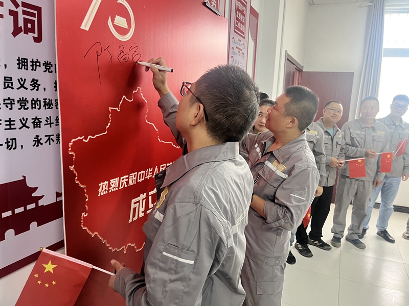 在公司黨員活動(dòng)室內(nèi),公司總經(jīng)理陳昌富帶領(lǐng)全體職工合唱歌曲“歌唱祖國”,全體人員懷著對黨、對祖國的滿腔熱忱在簽到墻上鄭重的簽上自己的名字;公司職工在馬塘湖礦各裝車點(diǎn)、磅房等多處插上了鮮艷的五星紅旗。雄壯嘹亮的歌聲是對祖國未來的無限憧憬,整齊有力的簽名是對祖國深深的祝福和崇高的敬意,飄揚(yáng)的五星紅旗表達(dá)了對偉大祖國真摯的自豪和驕傲。